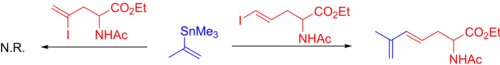 Vinylstannany a další alkenylstannany jsou široce používány.[10] Stannany se značně objemnými substituenty nebo substitucemi na α-uhlících reagují pomalu, například α-substituovaný vinylstannan vstupuje pouze do reakcí s koncovými jodidy.[49]
