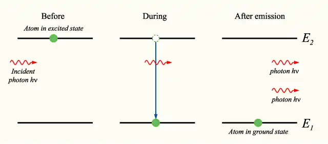 Elektrony v atomu mohou být umístěny v různých energetických hladinách. Platí, že čím dále jsou od jádra, tím vyšší mají energii. Vyšší energetická hladina, než je hladina základní, se nazývá excitovaný stav. Stimulovaná (též vynucená či indukovaná) emise je kvantový jev, při kterém dopadající částice (nejčastěji foton) stimuluje přechod excitovaného elektronu do základního stavu za současného vyzáření částice o stejných vlastnostech jako má částice stimulující. Pro jednoduchost předpokládejme pouze dvě energetické hladiny v kvantové soustavě (viz obrázek, kde E1 je soustava v základním stavu, a E2 je ve stavu excitovaném).[2]