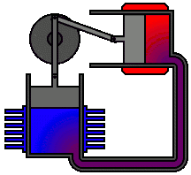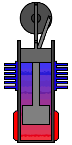 ![]() 1. Pracovní píst (tmavě šedý) stlačil plyn. Přehaněč (světle šedý) přesunul plyn na teplý konec válce. |