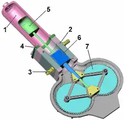 Dvouválcový Stirlingův motor s Rossovým vahadlem. Je to dvouválcový stroj s válci spojenými speciálním vahadlem. Konfigurace motoru s vahadlem byla vynalezena Andym Rossem.[17]