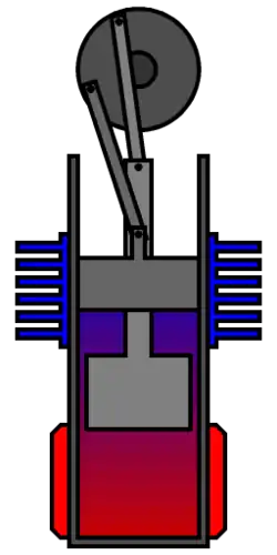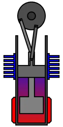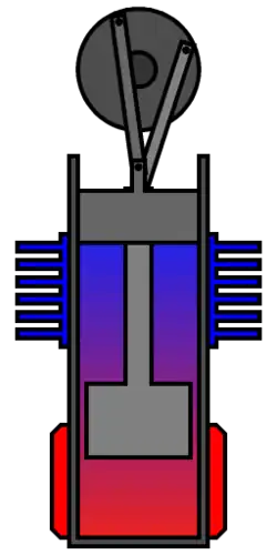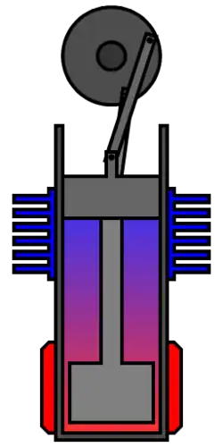 ![]() 1. Většina pracovního plynu je v teplém válci v kontaktu s jeho horkými stěnami. Plyn se zahřívá, jeho tlak roste a teplý píst je tlačen od horké hlavy válce. Expanze poté pokračuje ve studeném válci jehož píst je 90° pozadu za teplým pístem v cyklu klikového mechanismu. Studený válec začíná odebírat teplo plynu, který sem proudí z horkého válce. |