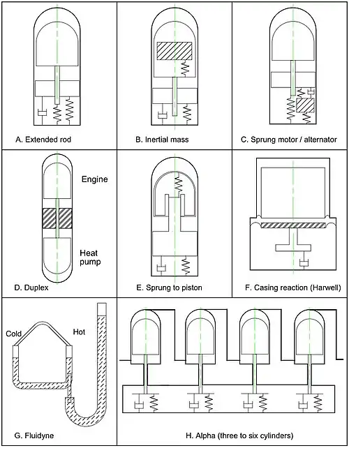 Existují dva hlavní typy Stirlingových strojů. Jsou rozlišeny způsobem, kterým přesunují pracovní plyn mezi teplou a studenou stranou stroje.
