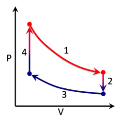 - Izotermická expanze probíhá při konstantní teplotě. Expanzní prostor a připojený výměník tepla (ohřívač) je udržován na konstantní vysoké teplotě. V pracovním plynu probíhá téměř izotermická expanze a plyn přijímá teplo z tepelného zdroje.
