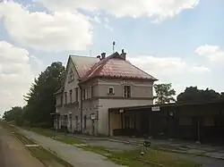 Původně v zastávce stál strážní domek, který byl nahrazen v roce 1871 novou výpravní budovou. Výpravní budovu navrhl inženýr-asistent Josef Chvála (1826–1872) v neoklasicistním stylu. Jedná se o typovou výpravní budovu 3. třídy se sedlovou střechou. Budova měla dvoupodlažní střední část na čtvercovém půdorysu obrácenou štítovým průčelím do kolejiště. Po stranách byla přistavěna přízemní křídla se dvěma okenními osami. Okna v přízemí měla půlkruhová zakončení lemované půlkruhovou profilovanou římsou, která nasedala na meziokenní římsu. Členění bylo doplněno pásovou a rohovou bosáží. V patře byla v lizénových rámech obdélná okna v profilovaných šambránách s nadokenní římsou. V roce 1930 byla výpravní budova přestavěna firmou Ing. O. Ježka z Prahy podle plánů architekta inženýra Miloše Fikra.[2] Ve výpravně byla postavena prezidentská čekárna, kterou využíval prezident Tomáš Garrigue Masaryk. V interiéru s hedvábnými tapetami byl kulatý stůl, psací stůl, několik klubovek a dvě pohovky.[4] Zařízení dodala pražská Továrna uměleckého nábytku architekta B. Pische.[2] V roce 1991 byla čekárna restaurována.[2][5]