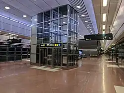 První má jeden krátký čtyřramenný eskalátor a pár výtahů z obou nástupišť. Je z něj možné jednak přestoupit na modrou linku metra pomocí dvou tříramenných eskalátorů a páru výtahů, nebo vystoupit do obří nádražní haly pomocí tříramenného eskalátoru paralelního s šikmým výtahem.