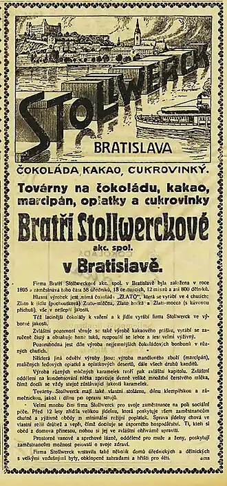 V roce 1839 začal v Kolíně nad Rýnem místní cukrář Franz Stollwerck vyrábět pastilky proti kašli. V roce 1860 rozšířil provoz o zpracování kakaa, které se stalo hlavním artiklem. Po otcově smrti firmu převzalo jeho pět synů a rozšířilo výrovní sortiment o marcipán a další cukrovinky. Roku 1871 založili akciovou společnost Bratři Stollwerckové (Gebrüder Stollwerck GmbH), které se podařilo proniknout do většiny zemí Evropy. V Rakousku-Uhersku sídlila jedna filiálka ve Vídni a druhá - údajně největší v monarchii - byla roku 1895 založena v Bratislavě a zaujala i významnou pozici v československém čokoládovém průmyslu.[1] Mimo jiné vyráběla také oblíbené čokolády značek Alpia a Alpenrose.