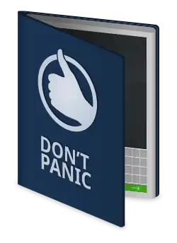 Kniha Stopařův průvodce po galaxii je pojmenovaná podle stejnojmenné (fiktivní) encyklopedie všeho vesmíru a vědění. V mnoha ležérnějších civilizacích na Východním okraji Galaxie dokonce Stopařův průvodce nahradil velkou Galaktickou encyklopedii jakožto zdroj veškerého vědění a moudrosti,[pozn. 1] neboť – ač má mnoho mezer a spousta informací je pochybných nebo přinejmenším hodně nepřesných – má proti starší a prozaičtější příručce dvě nesporné výhody. Jednak je o něco levnější, a především má na obálce velký vlídný nápis: DON'T PANIC (NEPROPADEJTE PANICE).
