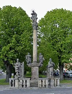- Morový sloup se sochou Panny Marie je morový sloup v dolní části náměstí. Původně obsahoval jen sochy dvou andělů z roku 1721 od K. Steyera. V roce 1726 byly doplněny na zábradlí sochy čtyř světců (svatý Prokop, Jan Nepomucký, svatý Florián a svatý Šebestián).