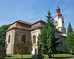 - Kostel svatého Zikmunda nechal postavit architektem J. J. Kurzem hrabě František Hartig v letech 1772–1779. Dříve na jeho místě stál menší renesanční kostelík[18] zasvěcený svatému Mikuláši, který hrabě nechal pro sešlost roku 1772 zbořit. Nový kostel byl vysvěcen 2. května 1781. U nového kostela je hřbitov a farní barokní budova římskokatolické církve. V kostele se konají pravidelně bohoslužby.