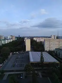 Budovy na jihozápadní straně jsou více než 50 metrů od silnice za trávníky, stromy a parkovišti. Jedná se o osm jedenáctipodlažních panelových bloků, které jsou propojeny příjezdovými komunikacemi. Jejich řada je přerušena panelákem a obchodním zařízením a končí budovou datového centra, které již není v provozu.