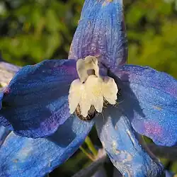 Na vrcholu lodyhy vyrůstá koncové hroznovité květenství o deseti až padesáti květy barvy světle až tmavě modré či nafialovělé, vzácně růžové či bílé. Květy s listeny a se stopkami s čárkovitými listenci mají pět okvětních lístků (někdy nazývané kališními) asi 2 cm dlouhých, horní nese ostruhu. V květu je více tyčinek s tmavými prašníky, tři pestíky a vespod čtyři tmavá, lístkovitá nektaria. Pro znesnadnění samoopylení dozrává v květu pyl dříve než dospějí blizny. Opylení zajišťuje hmyz.