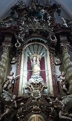 Ikonografie sochy vychází ze středověkých interpretací Zjevení svatého Jana, které popisuje Pannu Marii jako ženu sluncem oděnou s měsícem pod nohama. Originální dřevěná plastika madony byla vyřezaná z lipového dřeva a bez korunky měřila 110 cm. Jedná se o tak zvanou Assumptu – Královnu nebes. Madona stojící na půlměsíci obráceném směrem dolů symbolizuje Nanebevzatí Panny Marie jako Královny nebes s žezlem v pravé ruce a s dítětem v náručí.