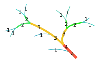 - pokud má uzel jednu větev se Strahlerovým číslem i a všechny ostatní větve mají Strahlerovo číslo menší než i, pak Strahlerovo číslo uzlu je i;