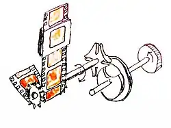 Strhovací mechanismus pohání maltézský kříž. Ten v principu funguje tak, že pohání ozubený váleček (na obrázku vlevo pod objektivem). Skrze perforační děrování filmu ozubený váleček strhává filmový pás a vše je přesně synchronizováno s rotující závěrkou následojícím způsobem: