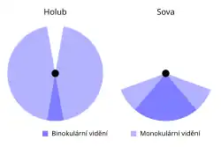 Soví oči jsou umístěny v přední části lebky tak daleko, jako u žádných jiných ptáků. Soví zorné pole má úhel kolem 110°, z nichž se kolem 60–70° překrývá, tzn. tato část vidění je binokulární. Binokulární vidění umožňuje vnímání hloubky prostoru, takže sovy při lovu dovedou dobře odhadnout vzdálenost a pozici kořisti. Řada jiných, hlavně nedravých druhů ptáků sice disponuje větším zorným polem, avšak jejich binokulární vidění je mnohem užší, protože jejich oči jsou umístěny po stranách hlavy. Např. holubi mají oči po stranách hlavy a jejich zorný úhel sice je 340°, nicméně jejich binokulární vidění pokrývá pouze asi 20° úhel. Monokulární vidění sice postačuje např. k vnímání hrozeb v okolí, k lovu je však neefektivní. Sovy nedostatečný úhel zorného pole kompenzují schopností otáčet hlavou až o 270°.[84][92] Studie z roku 2023 ukázala, že sovy jsou technicky schopné hlavou otočit i o 360°, nicméně k takovým rotacím ve volné přírodě ani v zajetí běžně nedochází.[93][94]