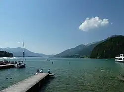 ![]() Strobl s Wolfgangsee a horami Rettenkogel (1780 m) (vlevo) a Sparber (1502 m) (vpravo) v pozadí. Menší, bližší dřevěný kopec je Hirsl, stínící vše kromě vrcholu Rinnkogelu (1823 m) | |