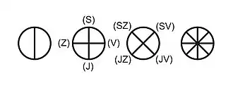 Tento symbol sestává z kruhu a dvou spojnic (vertikální a horizontální). Ty vytvářejí na kruhu čtyři body, které znázorňují jak slunovraty, tak i rovnodennosti (jarní a podzimní).