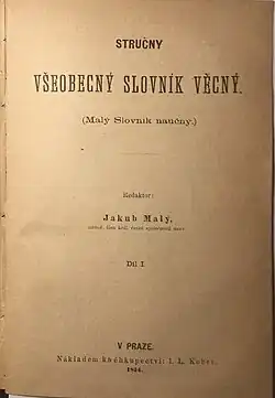 - ↑ MALÝ, Jakub. Stručný všeobecný slovník věcný: (malý slovník naučný). V Praze: I. L. Kober, 1881, s. [831]. Díl VI. Dostupné také z: https://kramerius5.nkp.cz/uuid/uuid:b2498a9a-bf15-4abf-8757-8ae01189cb0b. 17. dubna 2024. (Doslov k šestému dílu Stručného všeobecného slovníku věcného, který má celkem 8 svazků a odhadem jistě 5000 stran.)