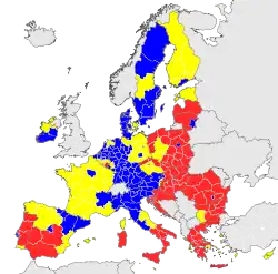 Kohezní fondy pomáhají regionům, které dosahují méně než 75% HDP EU (červené, tzv. méně rozvinuté regiony) či pod 100% (žluté, tzv. tranzitní regiony).