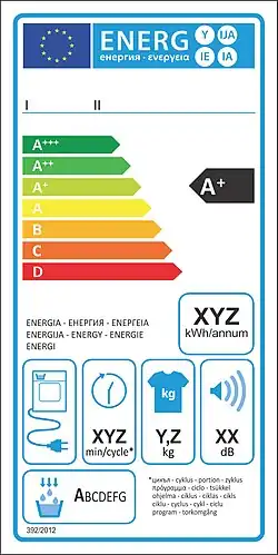 Stejně jako pro většinu domácích spotřebičů, i pro sušičky prádla platí povinné zveřejňování energetických štítků[4]. Energetický štítek sušičky uvádí její nejpodstatnější parametry: