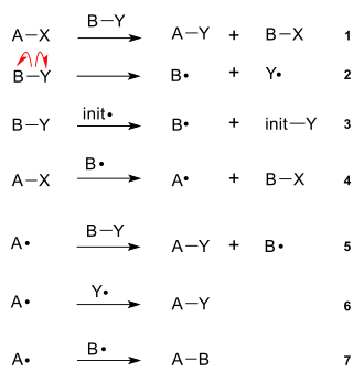 Na obrázku je příklad postupné radikálové substituce. V prvním kroku zvaném iniciace (2,3) je homolýzou vytvořen volný radikál. Homolýzu může vyvolat teplo, ultrafialové záření nebo iniciátory (například organické peroxidy nebo azosloučeniny).