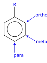 - U ortho-substituce jsou substituenty navázány na sousední pozice, které tak lze očíslovat 1 a 2. Na obrázku vpravo jsou tyto pozice označeny R a ortho.