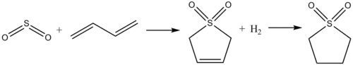 Původní metoda výroby sulfolanu vyvinutá v Shell Oil Company spočívala v reakci butadienu s oxidem siřičitým cheletropní reakcí za vzniku sulfolenu, který byl následně hydrogenován pomocí Raneyova niklu jako katalyzátoru na sulfolan.[4][5]