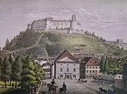 Stavovské divadlo v Lublani, místo premiéry Dusíkova Sultána Wampuma, rytina Franze Goldensteina z roku 1836