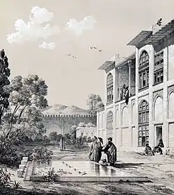 Palác Arg-e Karím Chán v Šírázu, rytina Eugèna Flandina z roku 1840