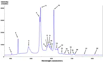 - použitím více současně zářících zdrojů, např. bíle svítící LED dioda, složená buď ze tří diod svítících červeně, zeleně a modře, nebo nověji z modré diody s přídavkem luminoforu, který mění část jejího modrého světla na žluté a doplňuje tak spektrální složení na zdánlivě bílé světlo. Viz též obrázek vpravo.