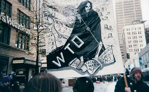 WTO je také kritizována zástupci ekologie. Tvrdí, že volný trh a deregulace má nepříznivý vliv na životní prostředí jako celek. Podle některých zastánců ochrany životního prostředí termín úspěch v interpretaci WTO není nic jiného než růst HDP a příjmů, což automaticky způsobuje lhostejnost k životnímu prostředí. Ve výsledku ochrana životního prostředí je zcela v rozporu se zvýšením efektivnosti v ekonomickém sektoru.[43]