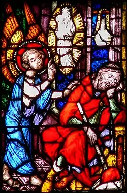 Josefův sen o Panně Marii s dítětem Ježíšem, sklomalba z mariánského okna, kolem 1385, Ulm, Münster