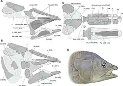 Rekonstrukce lebky a hlavy ryby Axelrodichthys megadromos z křídy (temně šedě zachovalé pozůstatky, světle rekonstruované kosti). Zejména na obrázcích A a B (boční a horní pohled na neurokranium, u obr. A též na závěs čelistí) je dobře patrný intrakraniální kloub jako přerušení neurokrania.