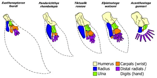 Do nejbližšího příbuzenstva pravých čtyřnožců patří několik rodů „ryb“ (nejznámější jsou Panderichthys, Elpistostege a Tiktaalik), které mají zploštělé tělo s širokou protaženou lebkou a oči posazené vysoko na hlavě (patrně sloužily k pozorování dění nad hladinou). Kostra jejich prsních ploutví se výrazně podobá kostře raných obojživelníků, obě hřbetní a řitní ploutev ztratily. Stále však měly kosmoidní šupiny. U tiktaalika se již odděluje pletenec předních ploutví od lebky a začíná se formovat krk. Prsní ploutve podle všeho byly schopny nazdvihnout přední část těla a hlavu nad vodu. Patrně šlo o predátora lovícího ve velmi mělkých vodách, jehož kořistí se stávaly i suchozemské organismy (např. členovci).[29]