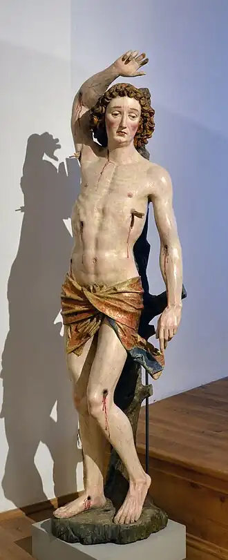 Předlohou kompozice mohl být grafický list Monogramisty E.S. z roku 1467 nebo kresba norimberského malíře Hanse Trauta[5] z konce 15. století,[6] ale pojetí se blíží spíše dřevořezu Albrechta Dürera z roku 1495. Světec je znázorněn v mírném kontrapostu, s rukama a nohama připoutanýma ke stromu. Skloněná hlava a nízko uvázaná rouška odpovídá Dürerově kresbě sv. Šebestiána a sv. Rocha z roku 1496 (Frankfurt am Main, Städel Museum, Graphische Sammlung),[7] kdy se vrátil z první cesty do Itálie, během které se seznámil s díly Andrea Mantegny. Socha vyniká dokonalou znalostí anatomie mužského těla s napjatými svaly. Realismus řezby podtrhuje zachovaná původní polychromie s bledou a místy namodralou kůží, prosvítajícími žílami a vytékajícími praménky krve.[8]