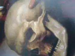 Značný podíl na působivosti obrazu má velká lidská lebka, namalovaná ve vysoce realistickém detailu v pravém dolním rohu – symbol askeze a smrti těla.[4] Jeroným na ni ukazuje prstem. Ale je ten muž, který si portrétovaného bedlivě prohlíží, skutečný světec? Zpodobení Jeronýma neboli Hieronyma ze Stridonu v té době často nabývalo nového, časového rozměru. Církevní otec byl čím dál častěji vnímán jako světský činitel na poli humanismu a literatury – a pro toto spojení by mohlo mluvit nádherně namalované zátiší s knihami v levém dolním rohu obrazu.