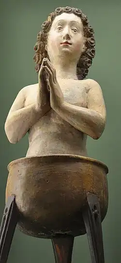 Sv. Vít mučen v kotli s vroucím olejem; dřevořezba kolem 1450, Museum Salzburg