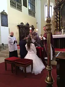 • Římskokatolická církev – svatební průvod vchází do kostela za doprovodu hudby, jako poslední přicházejí ženich s nevěstou k oltáři. Kněz odříkává pasáže z Písma svatého a předčítá svatební slib. Snoubenci si vymění prsteny, následuje závěrečná modlitba, zpěvy a blahopřání.