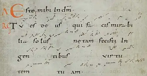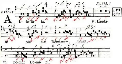 Graduale Triplex psaný červeným inkoustem, kde neumy svatohavelské školy jsou pod kvadrátní notací a pod metskou notací (černou barvou), umožňující synoptické čtení.
