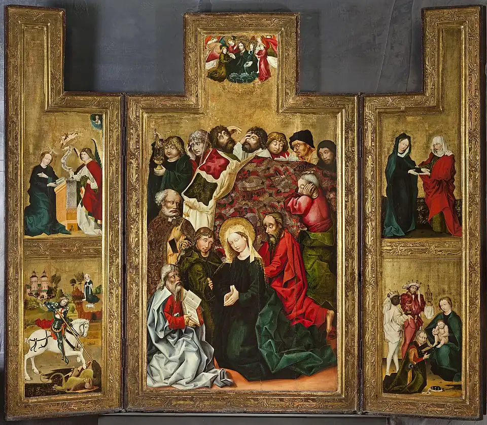 Na křídlech oltáře jsou tři výjevy ze života Panny Marie (Zvěstování, Navštívení, Klanění tří králů) a Zápas sv. Jiří s drakem. Centrální obraz i tři výjevy ze života Panny Marie mají jednotné zlacené pozadí zdobené podél rámu puncováním. Výjimkou je výjev sv. Jiří s drakem, kde je před zlaceným pozadím perspektivně znázorněná volná krajina s hradem a postavou zachráněné princezny.