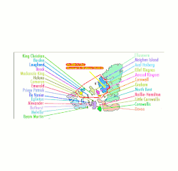 Největšími ostrovy jsou ostrov Axela Heiberga, Ellef Ringnes Island, Amund Ringnes Island, Cornwall Island, Graham Island, Meighen Island, King Christian Island a Stor Island. Souostroví také zahrnuje množství menších ostrovů. Jediné obydlené místo je Isachsen na Ellef Ringnes Island, což byla během let 1948 až 1978 meteorologická stanice s posádkou. Na ostrově Axela Heiberga se nachází McGill Arctic Research Station, která je obydlena jen během léta.