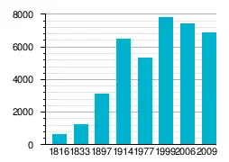 - 20. století: 1914 — 6 460 obyv.; 1977 — 5,3 tis. obyv.; 1999 — 7,8 tis. obyv.