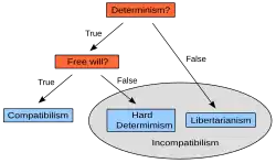 Determinismus je koncept, dle kterého je veškerý budoucí vývoj dán současným stavem (tedy událostmi, jež se již staly, a přírodními zákony). Kompatibilismus je přesvědčení, dle kterého je determinismus slučitelný se svobodnou vůlí (platí kladná odpověď na obě předchozí otázky).