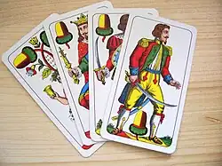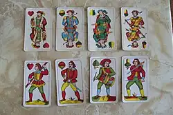 U mariášových karet jednohlavých i dvouhlavých je postava doplněna barevným znakem nahoře. Podobná karta spodek má tento znak dole či u pasu.