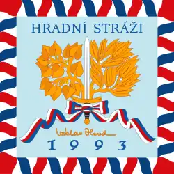 Znak Hradní stráže byl používán od ledna 1993, sankcionován (schválen vyhláškou) byl však až 5. listopadu 1999 s platností od 1. prosince 1999. Znak je tvořen (dle neheraldického, ba chybného popisu ve vyhlášce) třemi štíty s vyobrazením bílého Českého lva na červeném poli, červeno-bílé Moravské orlice a černé Slezské orlice ve žlutém poli, které jsou doplněny zlatými lipovými listy.[1]