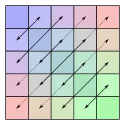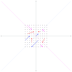U symetrických matic platí, že vlastní vektory (modrý a fialový) příslušné různým vlastním číslům (zde 3 a 1) jsou na sebe kolmé. Při provedení transformace odpovídající matici se modré vektory třikrát prodlouží, zatímco fialové vektory si svou délku zachovají.