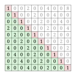 což je bloková diagonální matice s bloky a . Vzhledem k tomu, že matice je hermitovská a vektory tvoří ortonormální bázi, platí pro prvky matice s indexy , že: