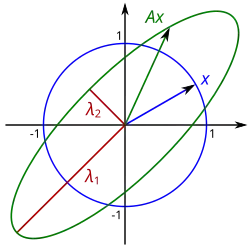 Jednotková kružnice je transformována na elipsu pomocí reálné symetrické matice řádu 2. Poloosy elipsy odpovídají vlastním vektorům matice a jejich délky vlastním číslům.