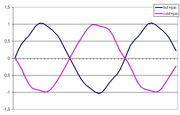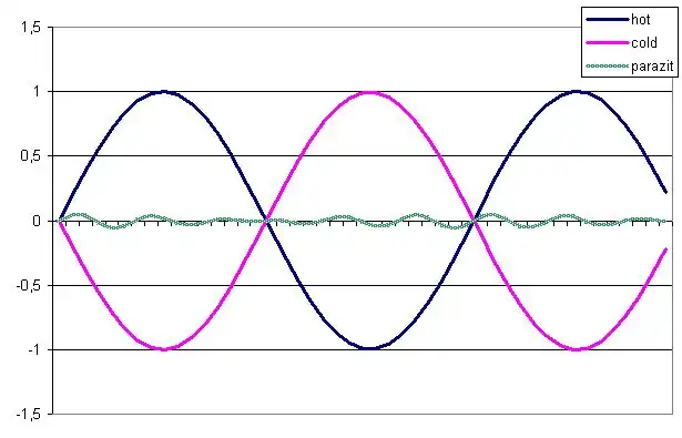 Další obrázek představuje oba signály (HOT i COLD) ovlivněné parazitním signálem. Všimněte si, že parazitní signál se přičetl k oběma signálům se stejnou polaritou. Tzn. v čase, kdy první signál má hodnotu +1 a druhý −1, jsou ovlivněny oba stejně signálem o velikosti např. +0,02. Budou mít tedy hodnoty HOT: +1,02 a COLD: −0,98.