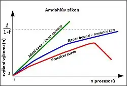 Amdahlův zákon vyjádřen graficky na obrázku vpravo. Jak je z obrázku patrné, s rostoucím počtem procesorů (popř. procesorových jader) neroste výpočetní výkon celého počítače lineárně, protože určitou část úlohy není možné provádět paralelně (například se jedná o vstup či výstup dat, přístup ke sdílenému prostředku atd.). Při použití architektury SMP však může snaha o souběžný přístup k operační paměti způsobit průběh naznačený červenou křivkou – pro velké množství procesorů je nejvíce procesorového času „promrháno“ arbitráží společné sběrnice.